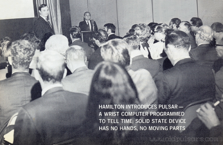 On May 6th, 1970, the announcement of the world's first digital watch was made at a press conference held at the Four Seasons Hotel in New York. Pictured above is George H. Thiess of Electro/Data (standing) being introduced by Hamilton's CEO, Richard J. Blakinger (at the podium). Thiess went on to discuss the watch and how it works and how it would change the way the world would tell time. You can read what happened from here on by going to the History section.